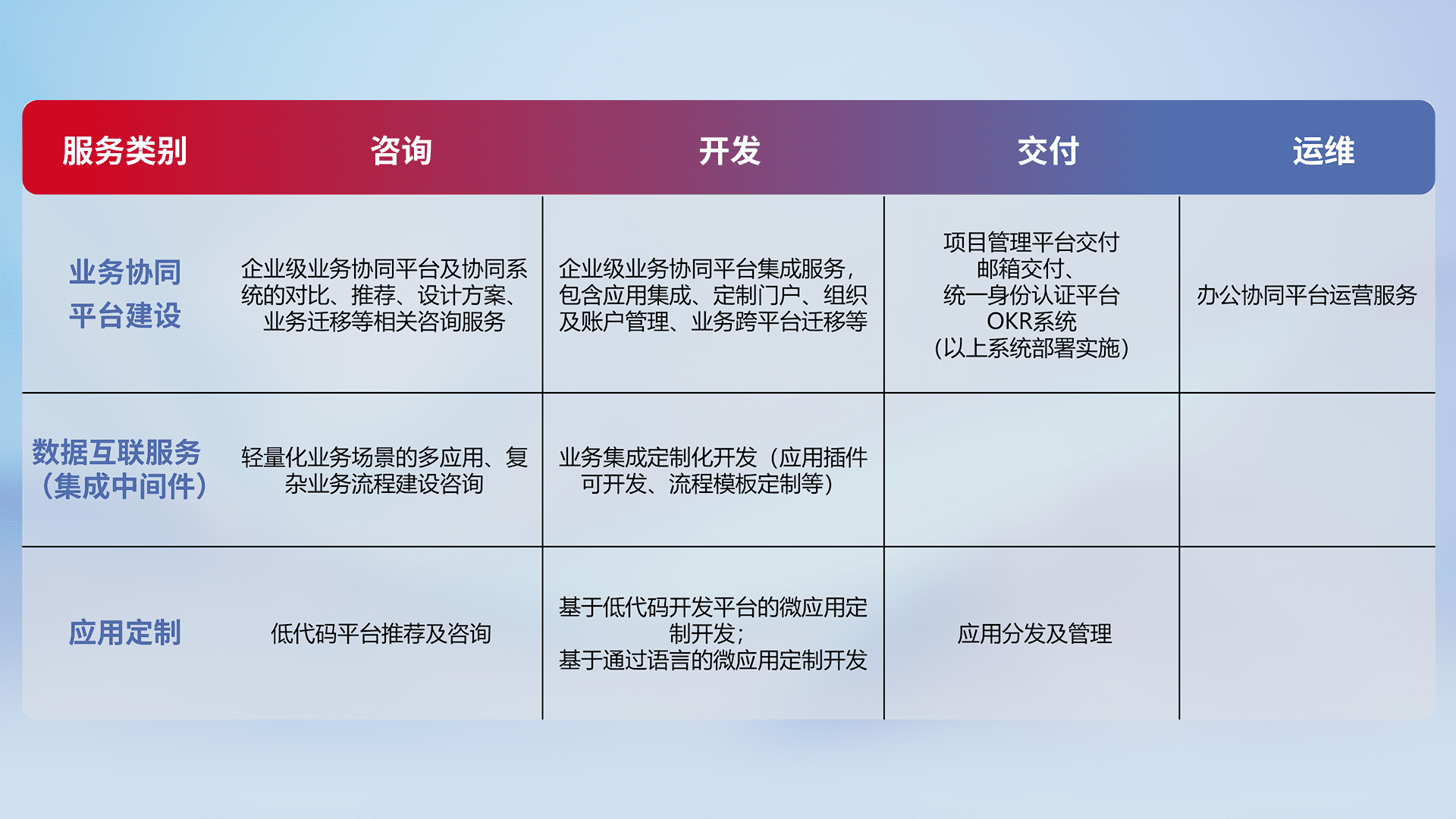 针对钉钉、、企微、、IDaas等平台级产品提供产品的规划、、、方案、、交付、、、定制化开发等服务,,,,实现如统一协同办公、、智能客户服务、、混合会议管理、、、智能数据查询、、等业务场景,,,,实现数字化转型。。。